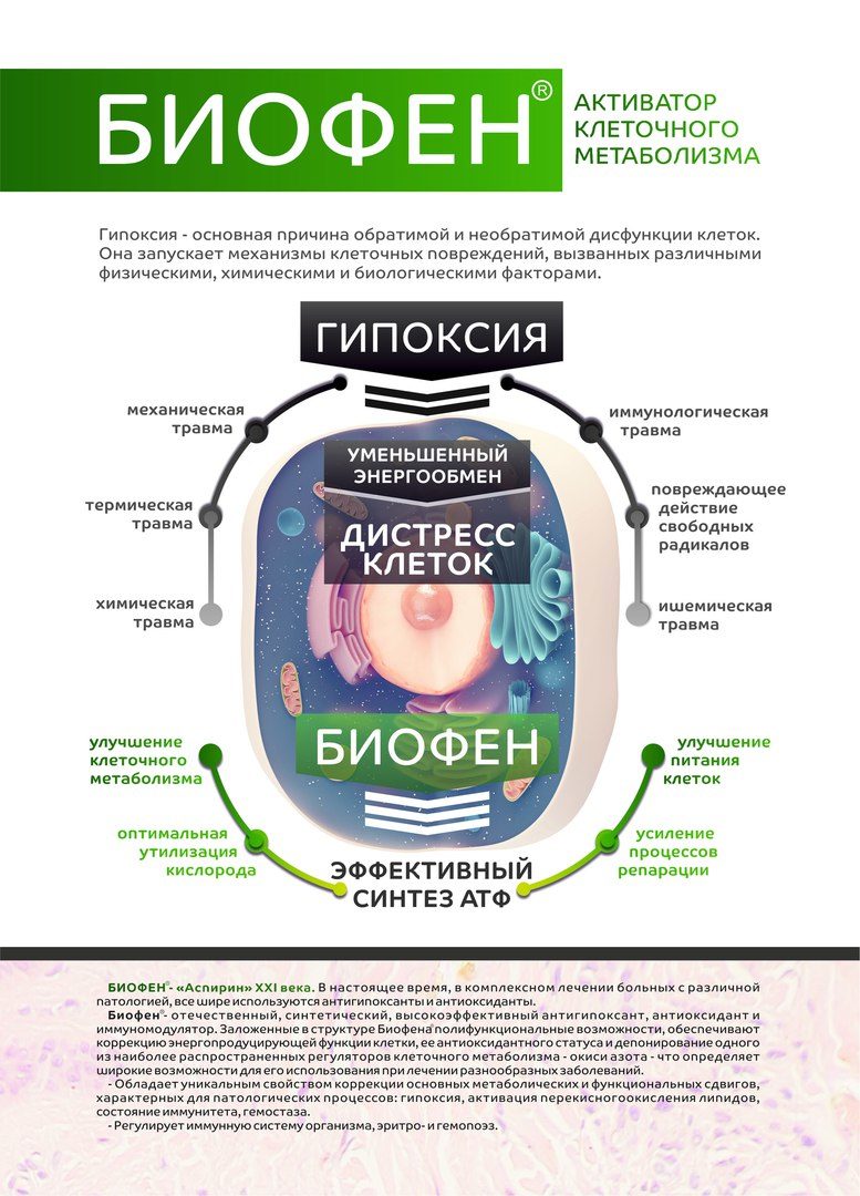 Биофен помогает предупреждать и устранять возрастные изменения. Эффективность препарата обусловлена его высокой биодоступностью, способностью быстро проникать в клетки. Благодаря особой молекулярной структуре полимер внедряется шунтирующим механизмом внутрь митохондрий, ответственных за усваивание кислорода, выработку энергии, поддержание нормального внутриклеточного биохимического баланса.
